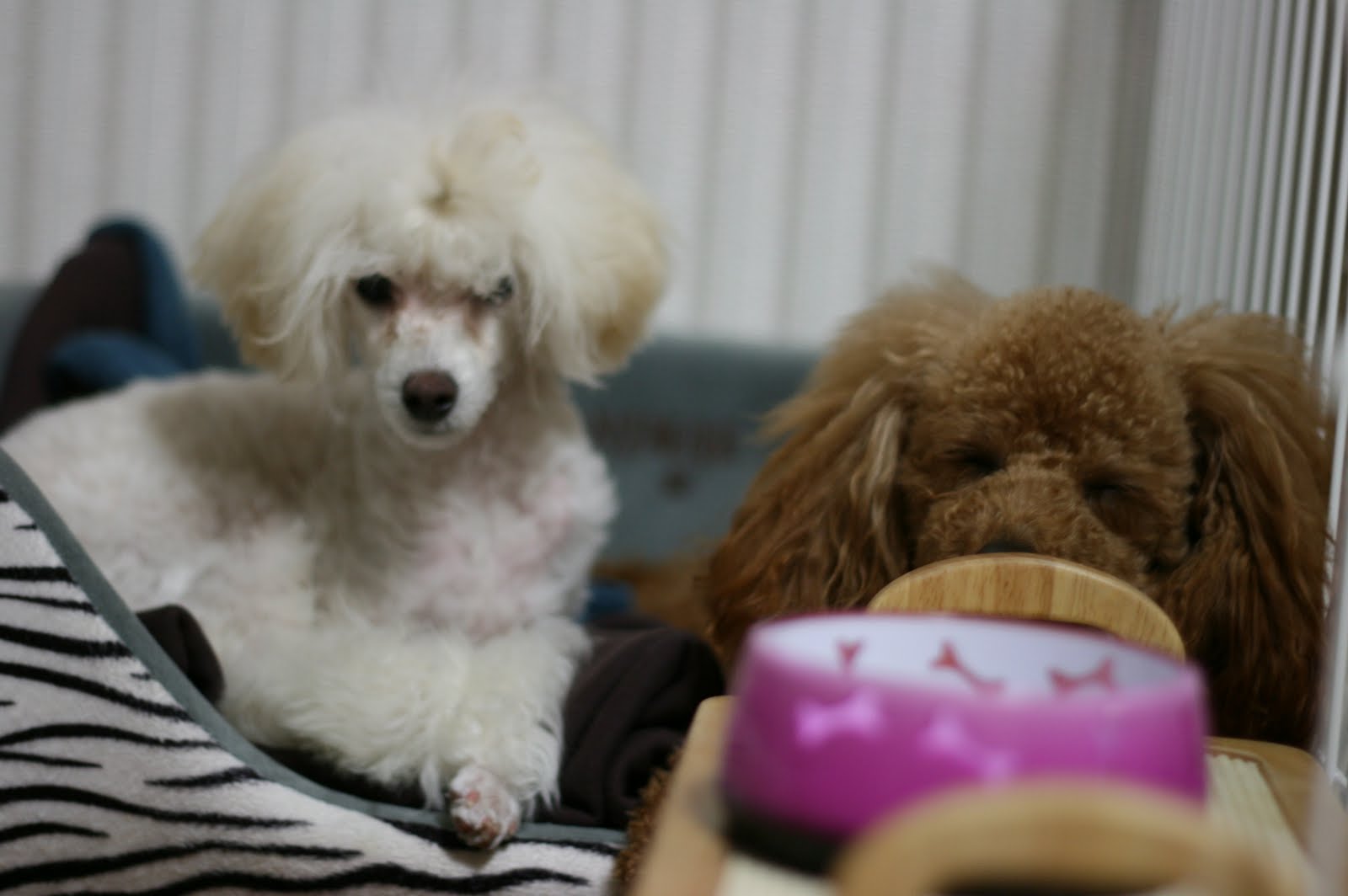2匹が静かだと思ってたら、なにやら「クチャクチャ」と食べる音がして、口の中を見てみたら、モヒートは“オーボールもどき”の欠片を、レチェは“食パンの中綿”を食べてました(汗)